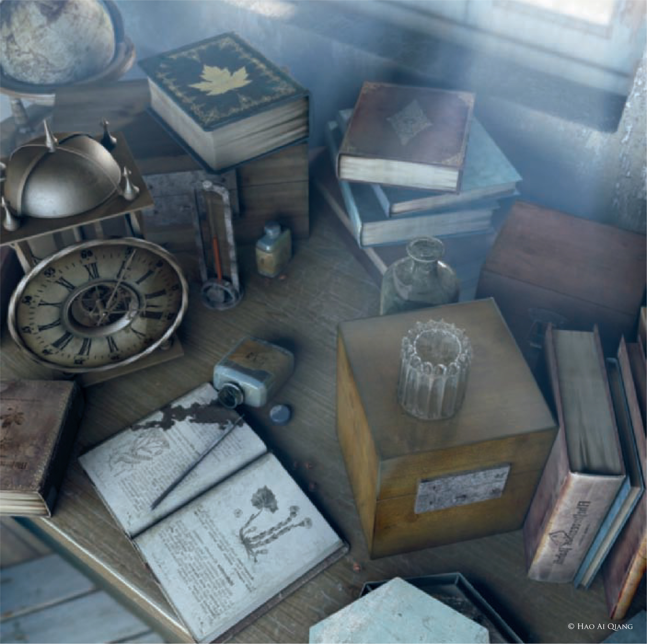 فرآیند خلق این اثر با ساخت یک پیشطرح سهبعدی مبتنی بر اشکال سادهٔ هندسی آغاز شد. هنرمند با تغییر زاویه دوربین و تنظیم نورهای مختلف، ترکیببندی نهایی را انتخاب کرد. در مرحلهٔ مدلسازی، از تکنیک پلیگان و سابدیویژن برای ایجاد سطوح نرم استفاده شد و تنها برای مدل ساعت از پلاگین AF Loft کمک گرفته شد که امکان ویرایش آسانتر و تنظیم UVها را فراهم میکرد.